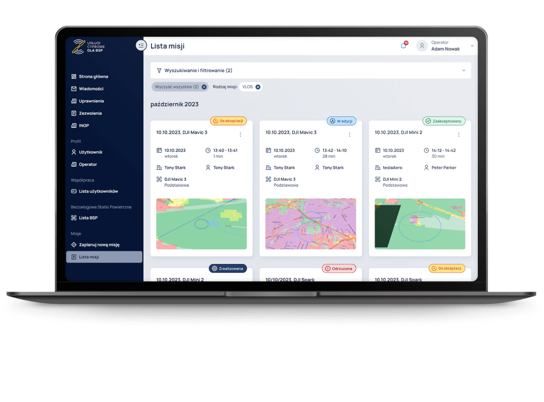Planowanie misjiInteligentne narzędzie do planowania misji! Automatyczne przetwarzanie różnych danych wesprze Cię w zaplanowaniu lotu zgodnego z przepisami i posiadanymi uprawnieniami, a równolegle dostarczy liczne informacje podnoszące bezpieczeństwo Twojego lotu.